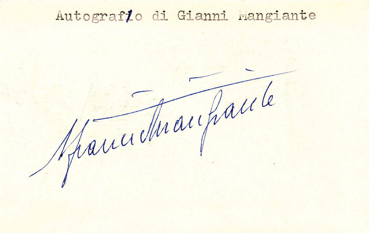 (1893-1967) Karteikarte mit original Signatur von Giovanni Mangiante (ITA). Goldmedaille im Mehrkampf II mit Italien. 10x6 cm.