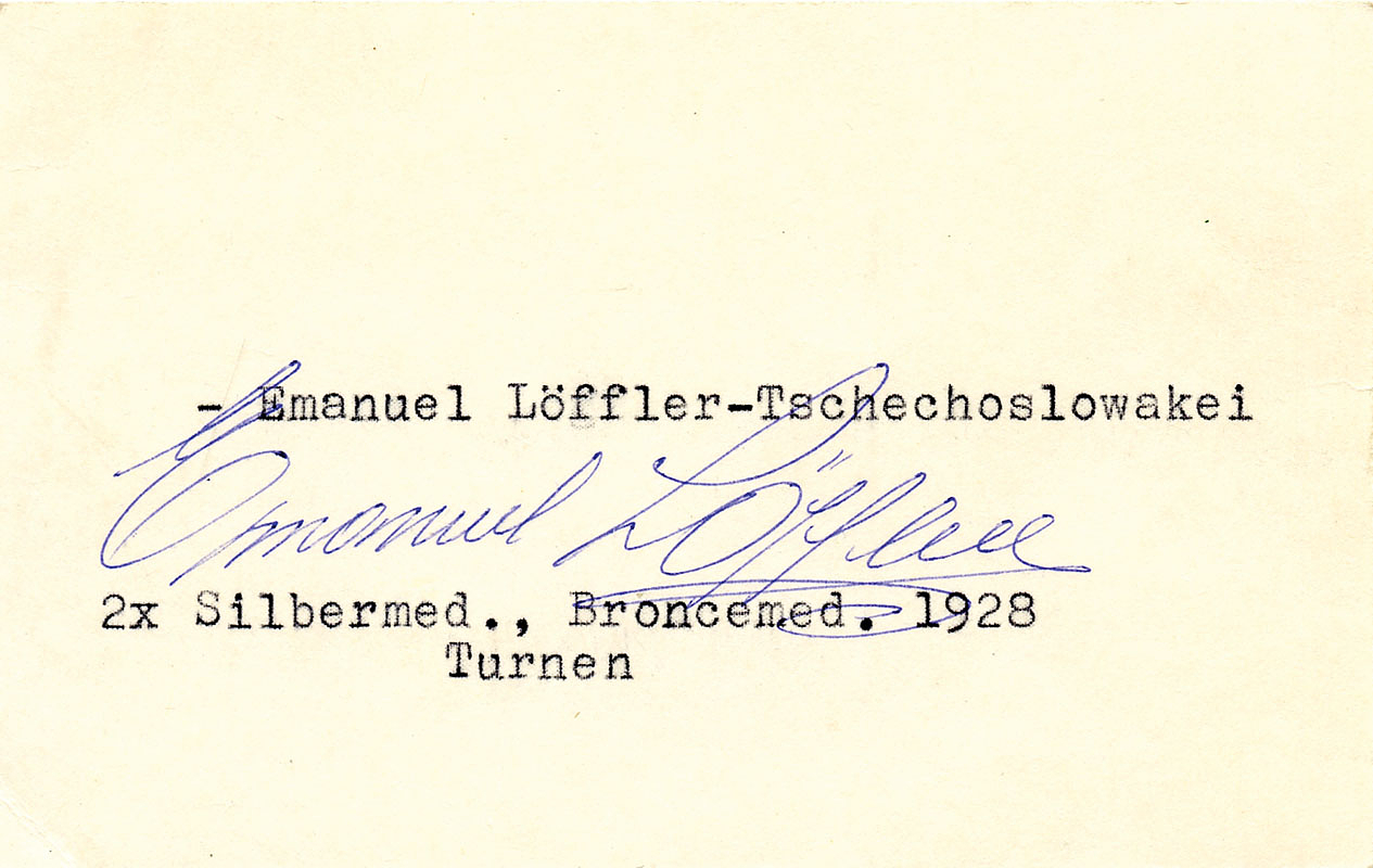 (1901-1986) Karteikarte mit Originalsignatur von Emanuel Löffler (CSR). Dreifacher Medaillengewinner bei den Olympischen Spielen 1928 im Turnen, 12x7 cm.