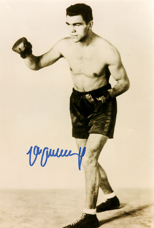 (1905-2005) Großes S/W-Reprofoto mit Originalsignatur von der deutschen Box-Legende und Weltmeister Max Schmeling. 30x20 cm.