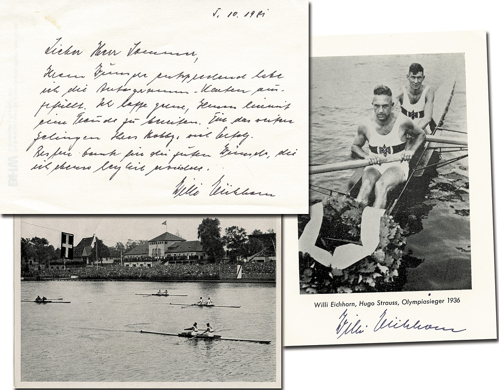 (1908-1994) S/W-Autogrammkarte "Willi Eichhorn, Hugo Strauss, Olympiasieger 1936" mit Originalsignatur vom Willi Eichhorn (GER) 15x10,5cm und ein handgeschriebener signierter Kurzbrief von Willi Eichorn, 15x10 cm.