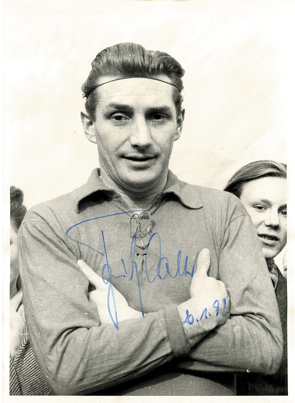 (1920-2002) s/w-Pressefoto (Schmidtpeter) mit Originalsignatur von Fritz Walter (61 A-LS, Ehrenspielführer der deutschen Fußball-Nationalmannschaft und Weltmeister 1954, 1.FC Kaiserslautern) signiert am 20.01.1992, 18x13 cm.
