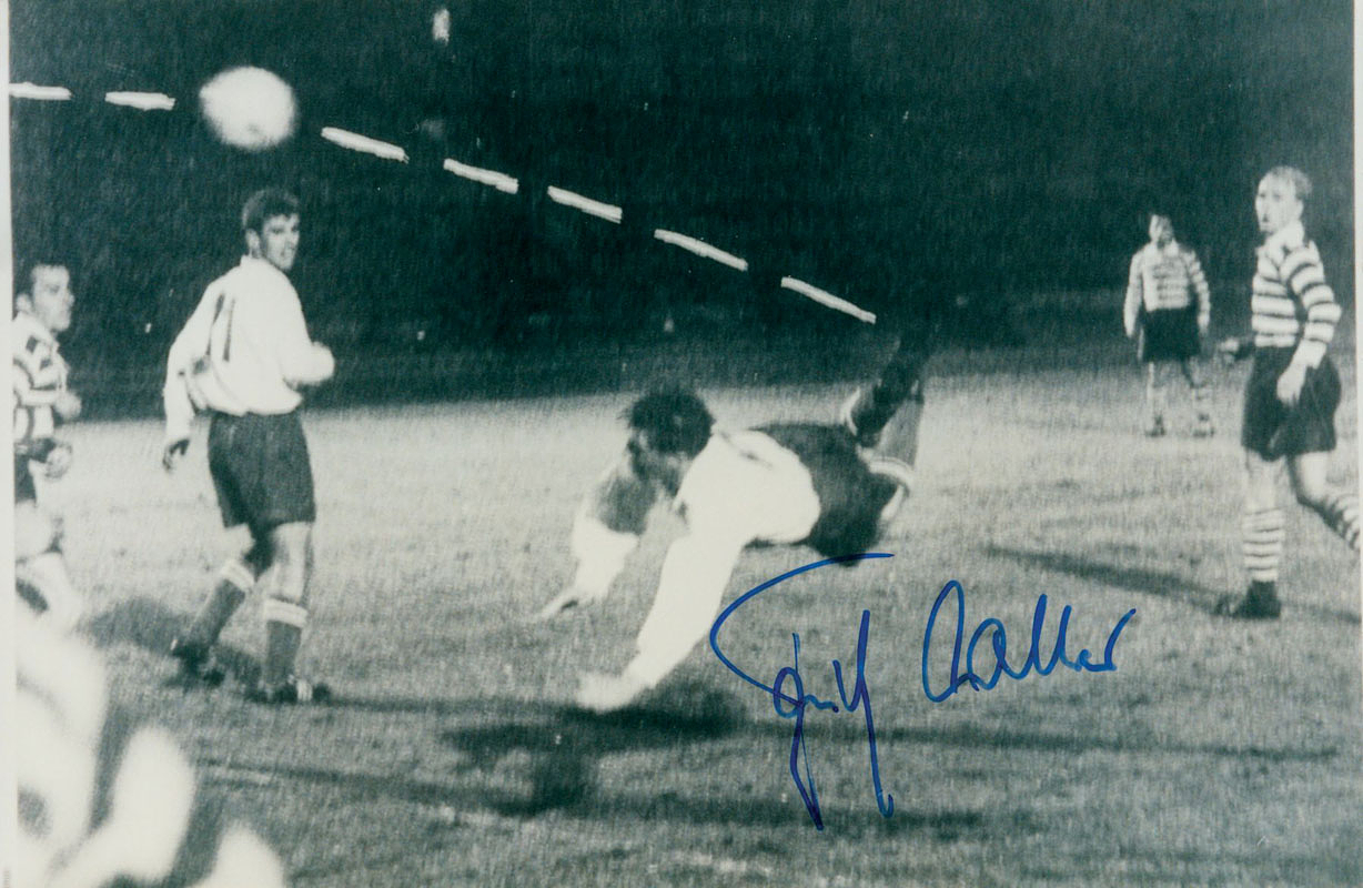 Das Foto zeigt Fritz Walter bei seinem weltberühmten Hackentor im Spiel Wismut Aue v 1.FC Kaiserslautern (5:3) am 6.10.1956 in Leipzig. Die gestrichelte Fluglinie des Balles wurde von Fotografen Beyer nachträglich aufgebracht! Rarität!. Zustand: A