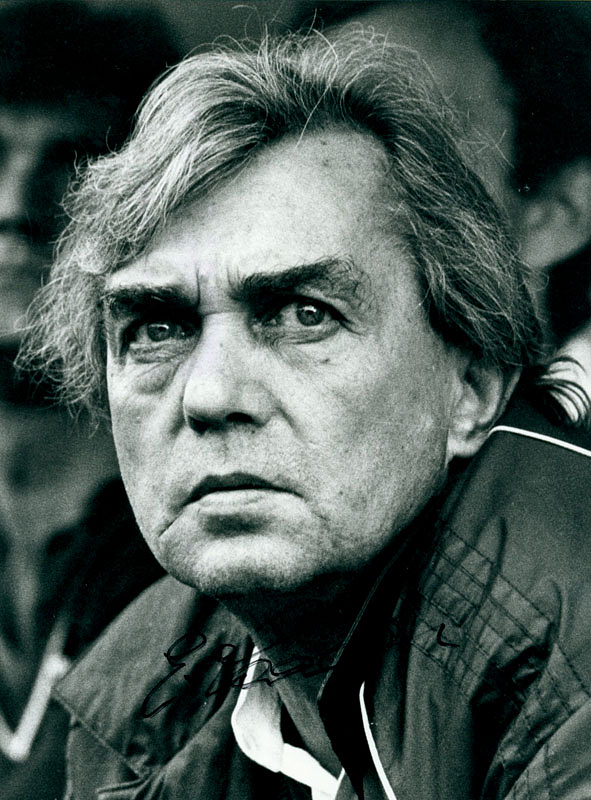 (1925-1992) S/W-Pressefoto (Hartung) mit original Signatur von Ernst Happel. Verstorbener Nationalspieler von Österreich und Startrainer Österreich, Niederlande, Hamburger SV, FC Sevilla, Feijenoord. 21x16 cm.