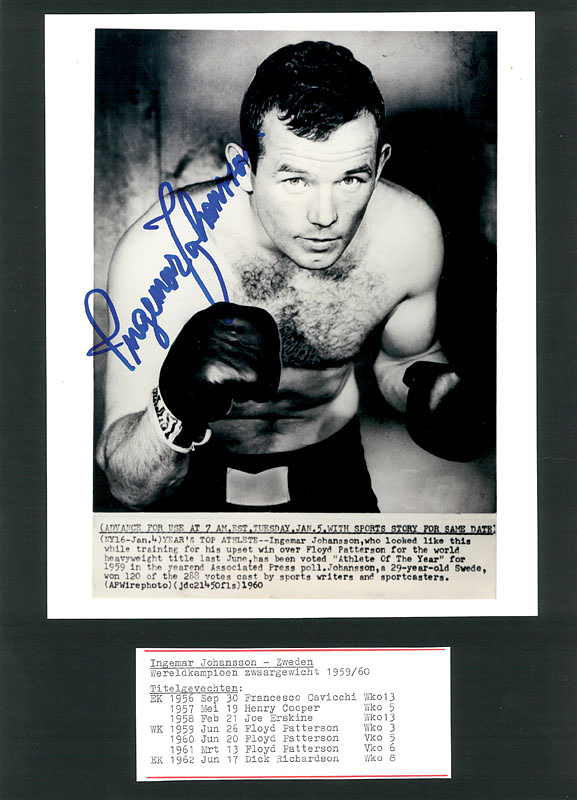 (1932-2009) s/w-Foto mit Originalsignatur von Ingemar "Ingo" Johansson, Schwergewichts-Boxer aus Schweden. 28 Kämpfe (17 K.O.-Siege, 9 Punktsiege und 2 K.O.-Niederlagen), Schwergewichts-Boxweltmeister 1959. Goldmedaille bei den Olympischen Spielen 1952. 25x20 cm. Aufgezogen auf schwarzen Karton, 34x24 cm.