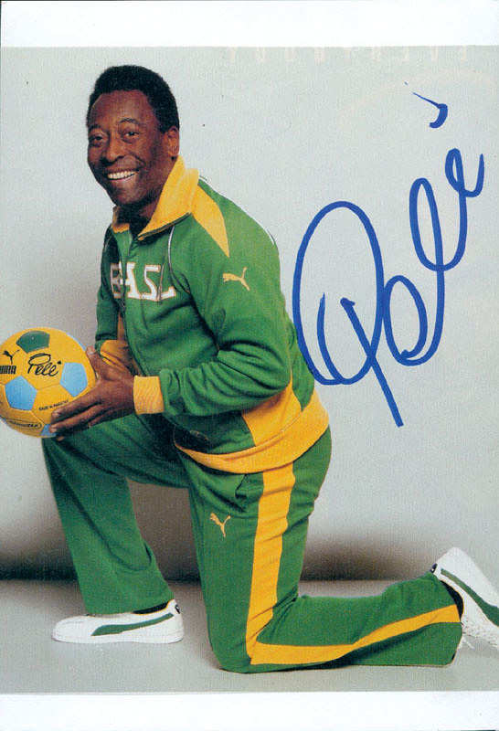 (1940-2022) Farbmagazinfoto mit Originalsignatur von Pele. (Brasilianischer Fußball - Weltmeister 1958, 1962 und 1970). 13x10 cm.