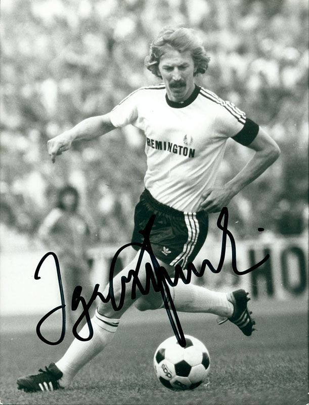 (1944-2022) S/w-Pressefoto (HorstMüller) mit Originalsignatur von Jürgen Grabowski (44 DFB A- Länderspiele 1966-74; Fußball - Weltmeister 1974; Eintracht Frankfurt) im Trikot von Eintracht Frankfurt,21,5x16,5 - 23,9x18,2 cm.
