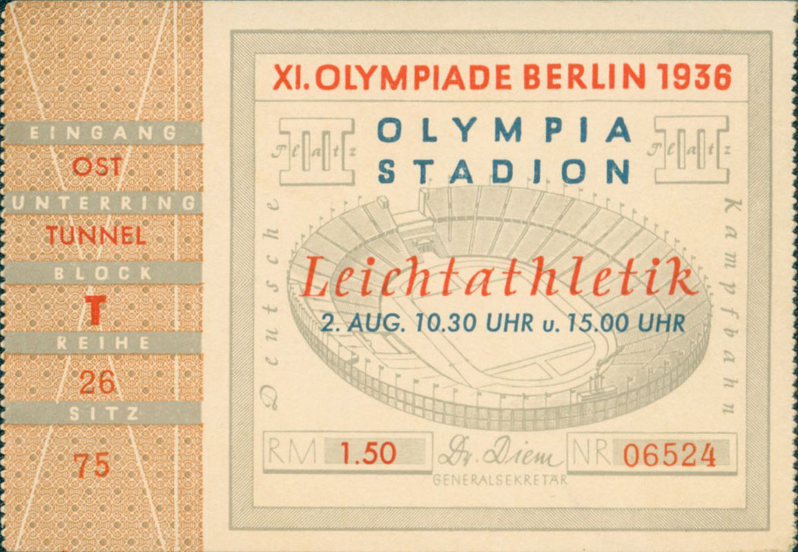 Original Ticket von den Olymischen Spielen 1936. Mit den Finals 10.000 m, Hochsprung, Kugelstoßen und Speer Frauen. Vorläufe 100 m mit Jesse Owens. Zustand: B
