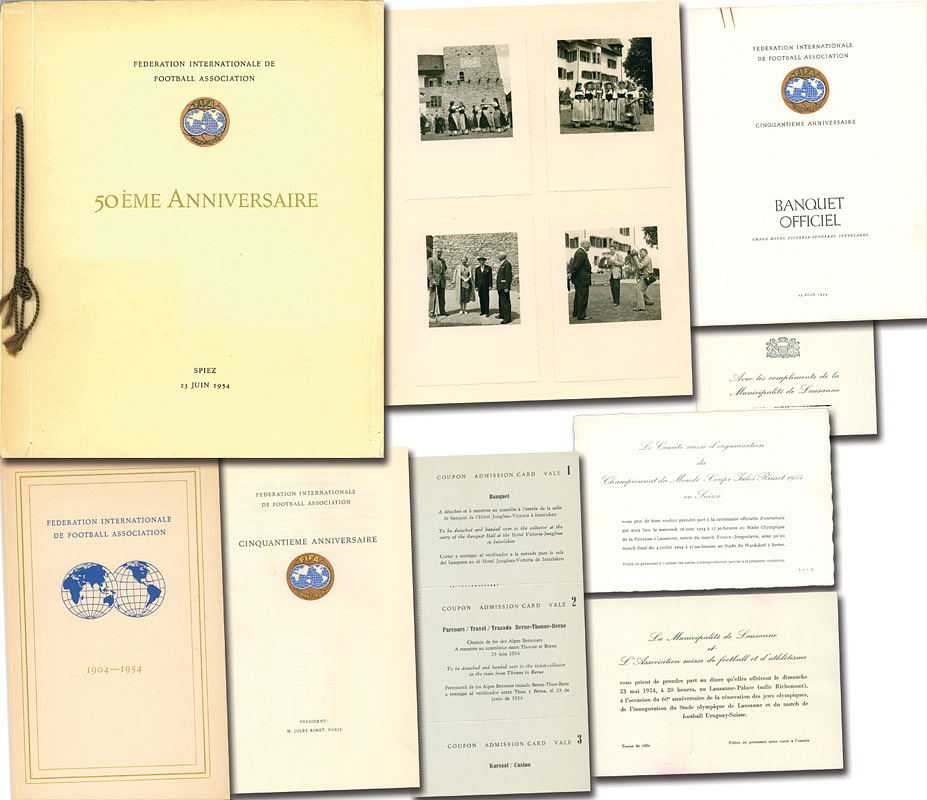 6 Stücke aus dem Nachlass eines hohen FIFA-Funktionärs zum 50jährigen Jubiläum der FIFA 1954: 1) 50eme Anniversiare Spiez 23 Juin 1954. Offizielles Fotoalbum der FIFA für die Teilnehmer an Jubiläumsfeier. 13 Albumblätter mit ca. 50 original S/W-Fotos (alle per Hand in das Album montiert), die Feier zum 50jährigen Jubiläum dokumentieren. Auf vielen Fotos ist der FIFA-Präsident Jules Rimet abgebildet. Karton, 26x22 cm. Auflage ca. 100 Exemplare!. 2) FIFA Ciquantieme Anniversaire 1904-1954. Offizielles Programm für die Jubiläumsfeier am 23.06.1954. Viersprachig. 46 Seiten mit Fotos allen Tickets für das Bankett. Karton 22x13 cm. 3) Speisekarte "Banquett Officiel". 4 Seiten, 19x15 cm. 4-6) Drei Karten die die FIFA-Executivmitlglieder anläßlich der Fußball - Weltmeisterschaft 1954 erhielten. Karton, 15x10 + 10x7,5 cm.