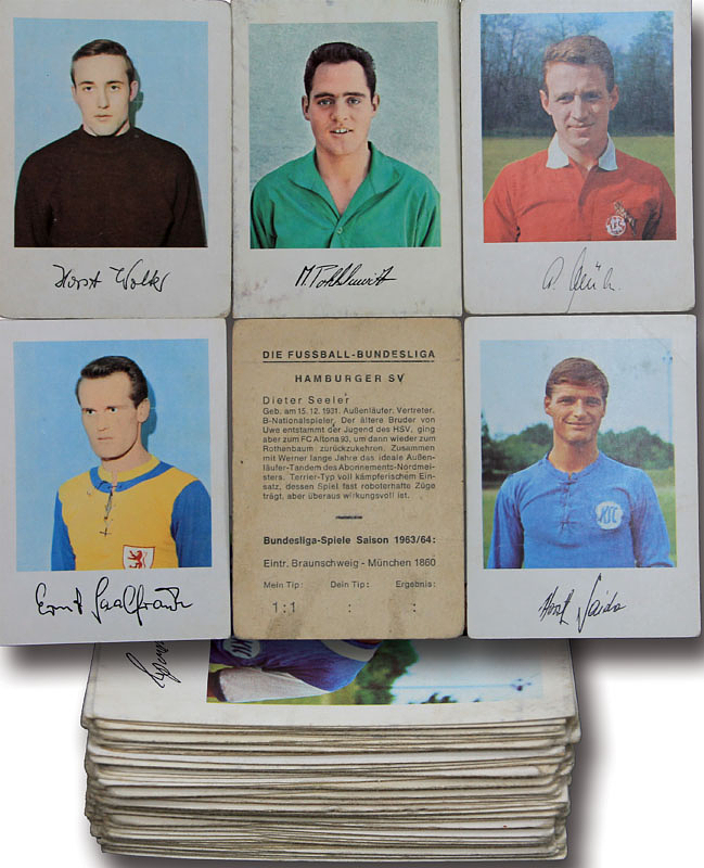 76 Fußballeinzelbilder der Firma Heinerle „Die Fussball-Bundesliga“ Saison 1963/64 mit faksimilierten Unterschriften der Spieler. Karton Je 9x6,5 cm.