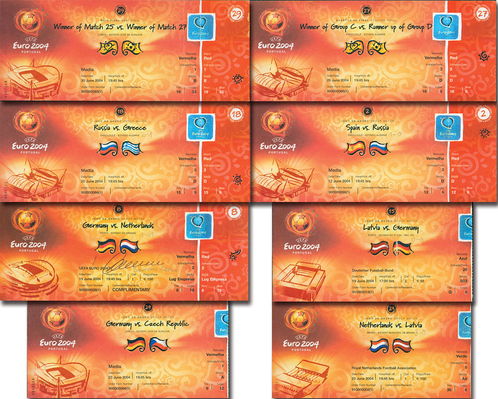 8 verschiedene Tickets der UEFA Euro 2004 Fußball-Europameisterschaft in Portugal, 20x8 cm und 16x8 cm.