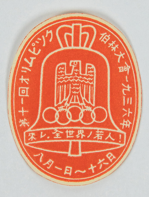 8 verschiedene Werbevignetten der Olympischen Spiele Berlin 1936 in verschiegenen Sprachen, je 3,5x2,8 cm.