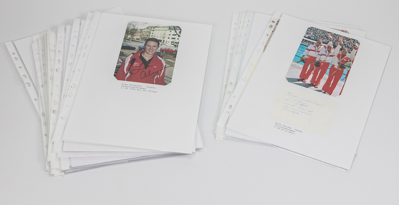 80 Autogrammbelege von fast allen Medaillengewinnerinnen der Olympischen Spiele im Synchronschwimmen vom Olympiadebüt 1984 bis 2004. Mit original Signaturen aus verschiedenen Ländern (USA, Canada, Russland, UdSSR/Russland, Japan ect.) auf Autogrammkarten, Fotobelege, Blancobelege, je 20x10 bis 6x6 cm.
