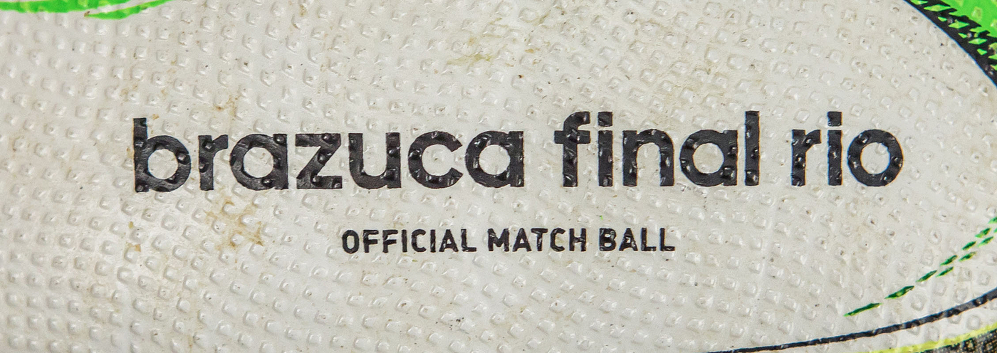„Adidas Brazuca final rio Official Match Ball FIFA World Cup Brazil" 2014. Ohne Aufdruck der Endspielpaarung. FIFA approved (A). Größe 5. Made in China. Herstellungdatum 01/14 (Januar 2014). Mit original Widmung von Sepp Blatter an einen hohen deutschen Fußballfunktionär "3.3.2015 happy birthday Sepp Blatter". Ball mit Spielspuren.