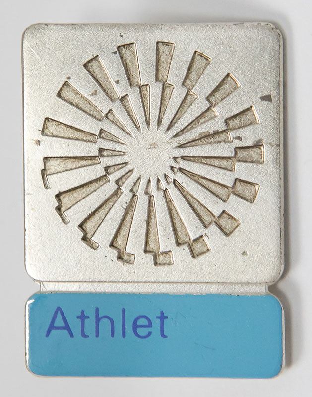 „Athlet“. Bronze, versilbert, hellblaue Schriftleiste. Offizielles Teilnehmerabzeichen Olympische Spiele München 1972. 3,5x2,5 cm.