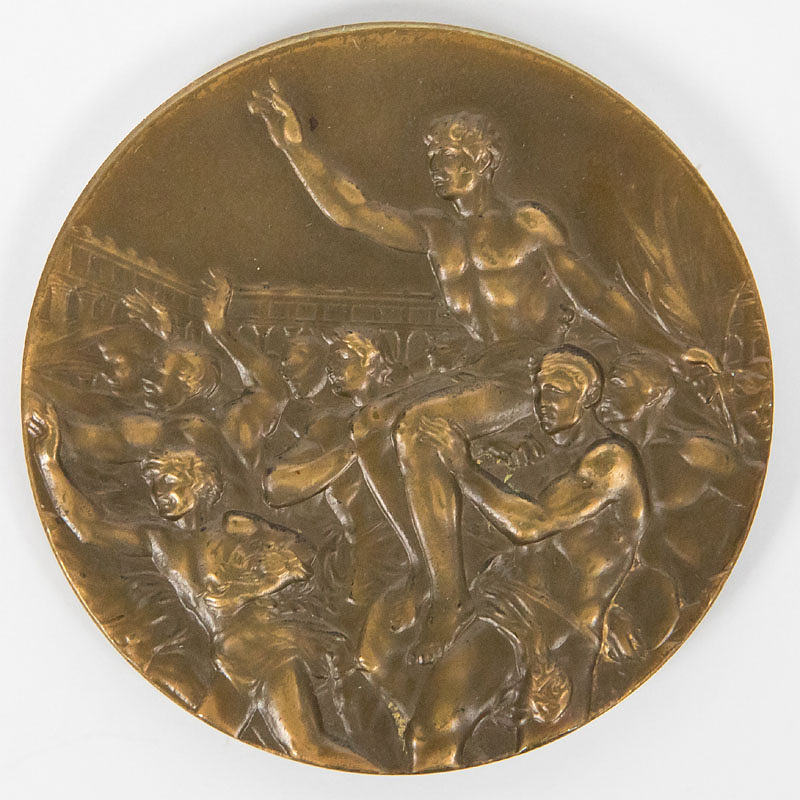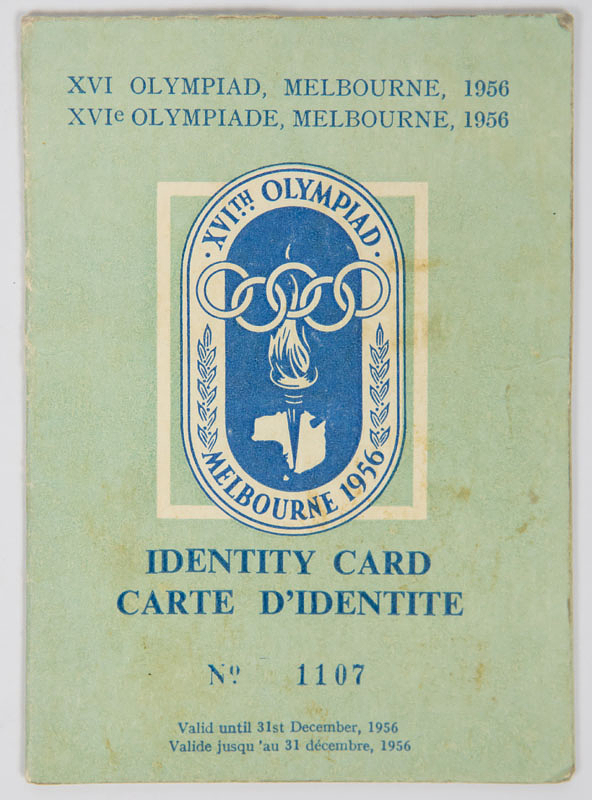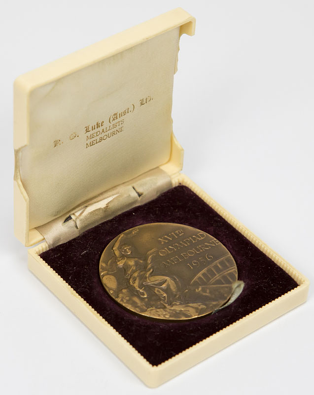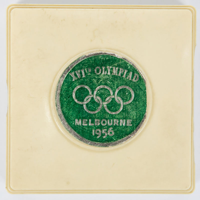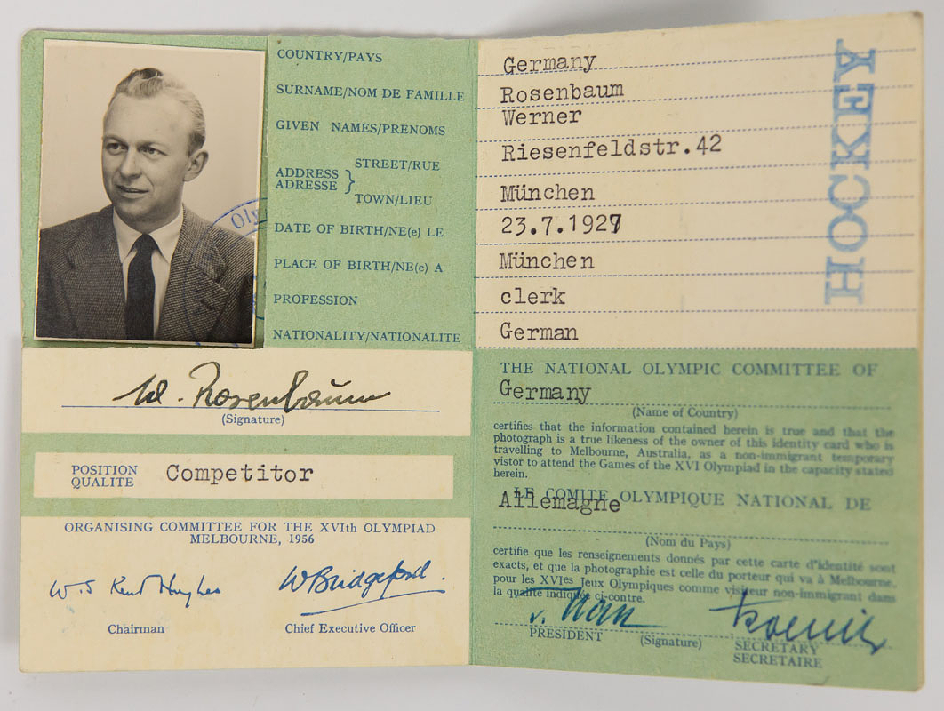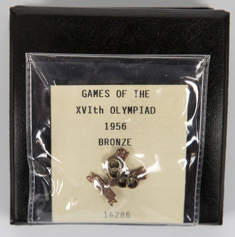 Bronzemedaille für einen 3.Platz im Hockey bei den Olympischen Sommerspielen Melbourne 1956 für Deutschland von Werner Rosenbaum (1927-2008). Bronze, Gewicht: 64 Gramm, 5 cm. In original Kunststoffbox des Herstellers: "K.G.Luke Ltd" 7,5x7,5 x2 cm. Dabei: Original Olympiaausweis von Rosenbaum mit original Signatzr und Passfoto, 4 Seiten, Karton, 11x8 cm. Außerdem: IOC Siegerpin fü die Bronzemedaille mi der Nr. 14286. 1,5x1,3 cm. In original Verpackung.