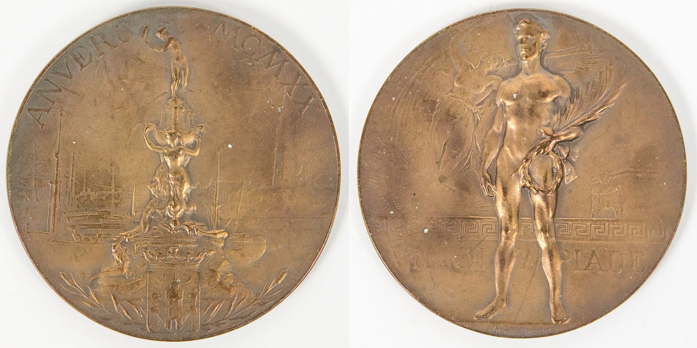 Bronzemedaille von den VII. Olympischen Spielen 1920 in Antwerpen für den 3.Platz. Bronze, 6 cm (Entwurf von Josué Dupon).
