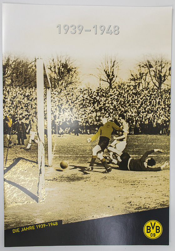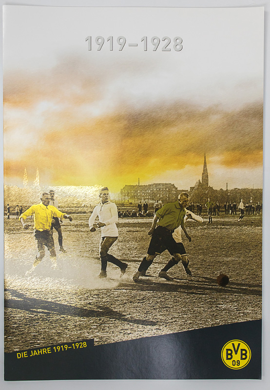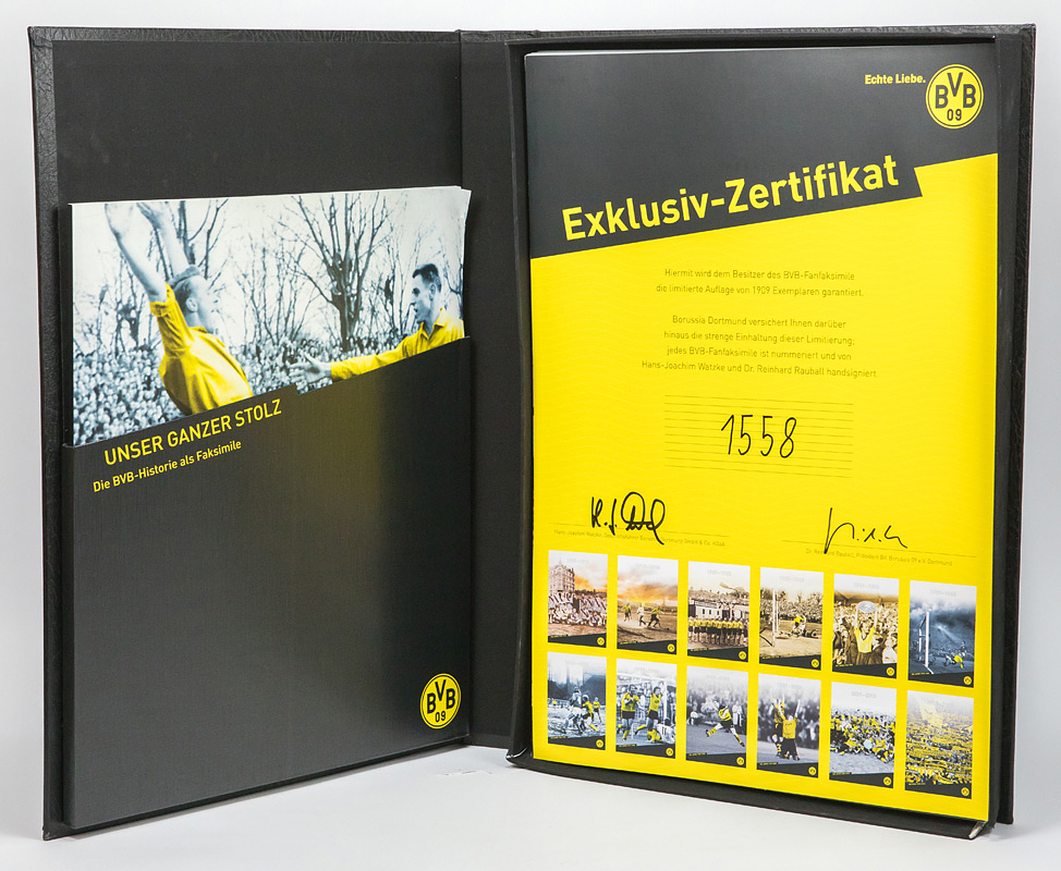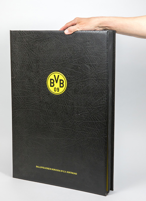 "BVB Borussia Dortmund. Unser ganzer Stolz. Die BVB-Historie als Faksimile". 12 Mappen mit großfornatigen historischen Fotos von Borussa Dortmund 1909 bis 2013. In einer Kunstlederkassette mit aufgesetztem Logo des BVB. 62x43,5x8 cm. Gewicht: 10,4 kg. Nummeriertes Exemplar "1505" der limitierten Auflage von 1904 Exemplaren. Mit original Signaturen von Joachim Watzke und reinhard Rauball.