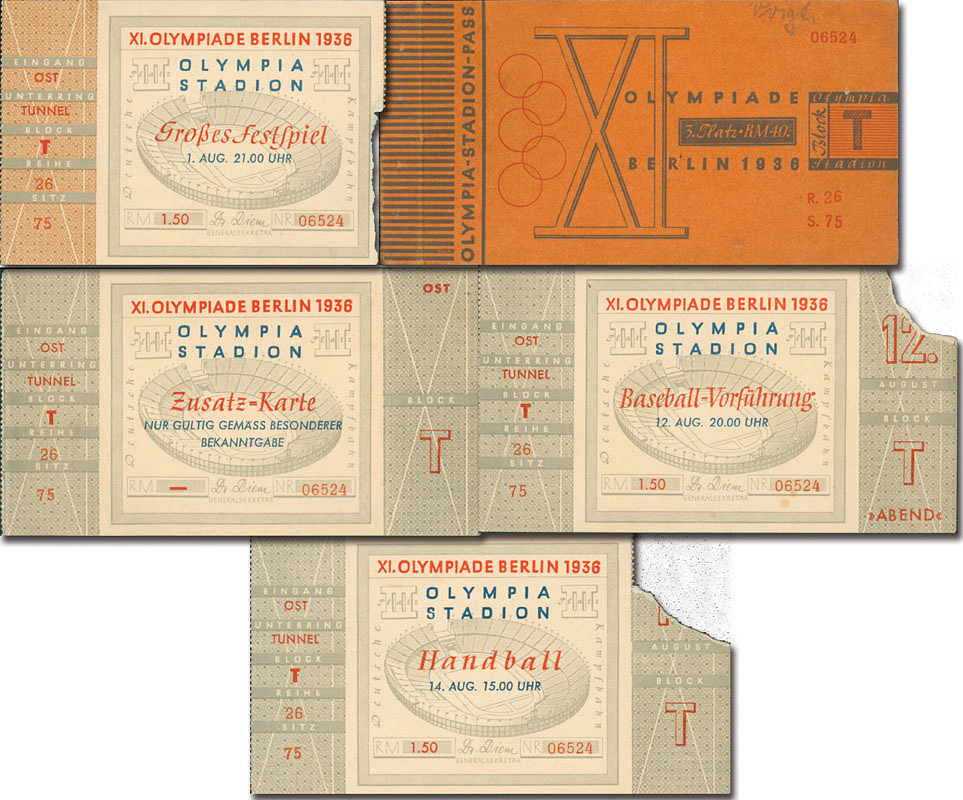 Dauerkarte. Olympia-Stadion-Pass "No. 6524". Stammheft mit 4 Eintrittskarten!!!!. Olympia-Stadion. Für verscheidene Veranstaltungen im Olympia-Stadion vom 1.8.-16.8.1936. 13,5x7 cm.