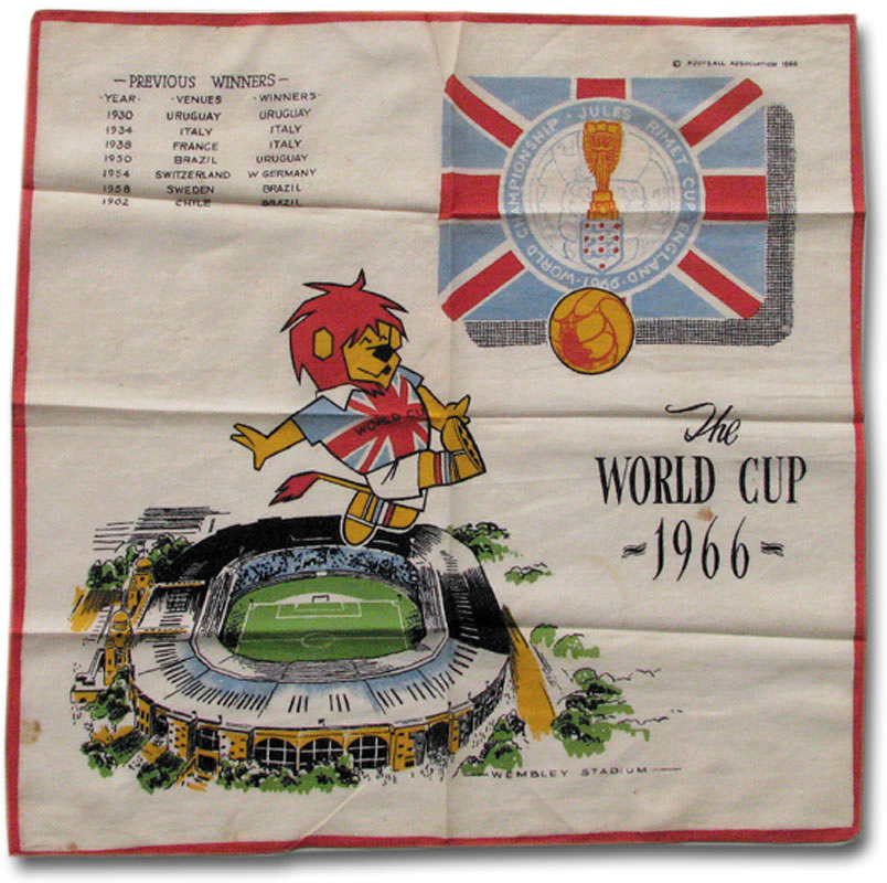 Dekroatives, farbig bedrucktes Seidentuch "The World Cup 1966" mit World Cup Willi, offiziellen Logo der Fußball-Weltmeisterschaft 1966 und dem Wembley Stadion. 42x42 cm.