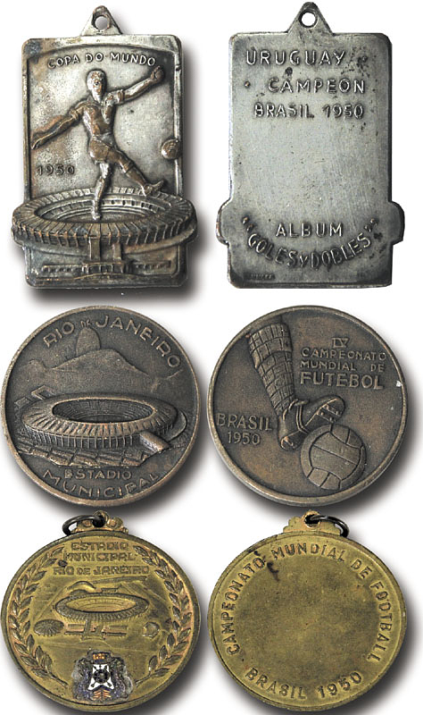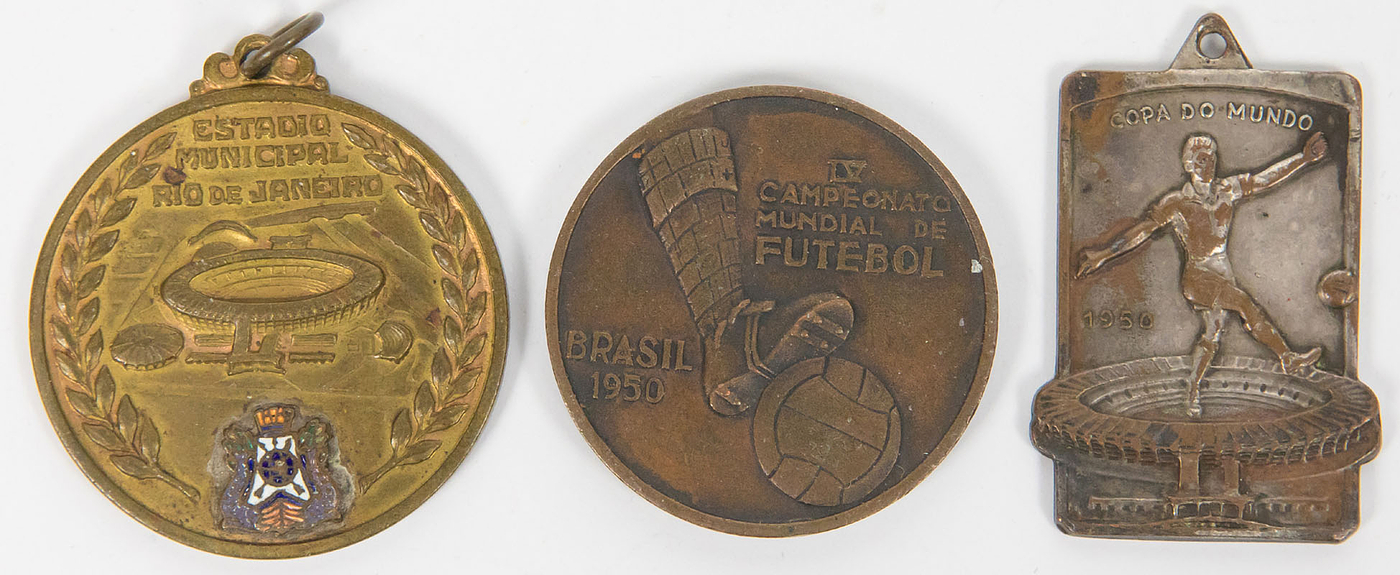 Drei Erinnerungsmedaillen an die Fußball - Weltmeisterschaft 1950 in Brasilien: 1) Erinnerungsmedaille des brasilianischen Fußballverbandes. Vorderseite mit der Aufschrift: Estadio Municipal Rio de Janeiro" und aufgesetztem, mehrfarbig emailierten Logo. Rückseite mit Inschrift: "Campeonato Mundial de Football Brasil 1950". Bronze, 3,5 cm. 2) Erinnerungsmedaille mit dem offiziellen Logo der Fußball-WM und Inschrift "IV Campeonato Mundial de Futebol Brasil 1950". Auf der Rückseite „Estadio Municipal Rio de Janeiro“ mit Ansicht des Stadions.. Hersteller: "Gazola" (Randgravur). Bronze, 3,5 cm (Gewicht: 25 Gramm). 3) "Copa do Mundo 1950" Rückseite: "Uruguay Campeon del Mundo 1950. Rio de Janeiro, Brasil". Erinnerungsplakette an die Fußball-Weltmeisterschaft1950. Bronze, versilbert 4x2,8 cm.