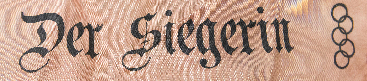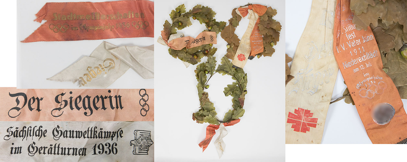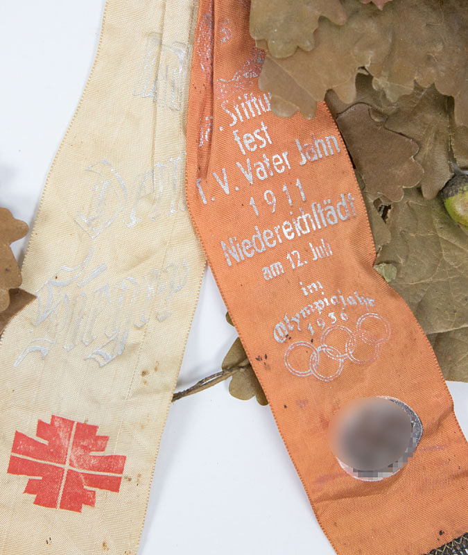 Drei verschiedene Siegerkränze Eichenlaub mit bedruckten Siegerschleifen. Alle mit Olympischen Ringen. Wurden die Sieger an lokalen Sportwettbewerben im Jahr 1936 ausgegeben. Je 30x24 cm.