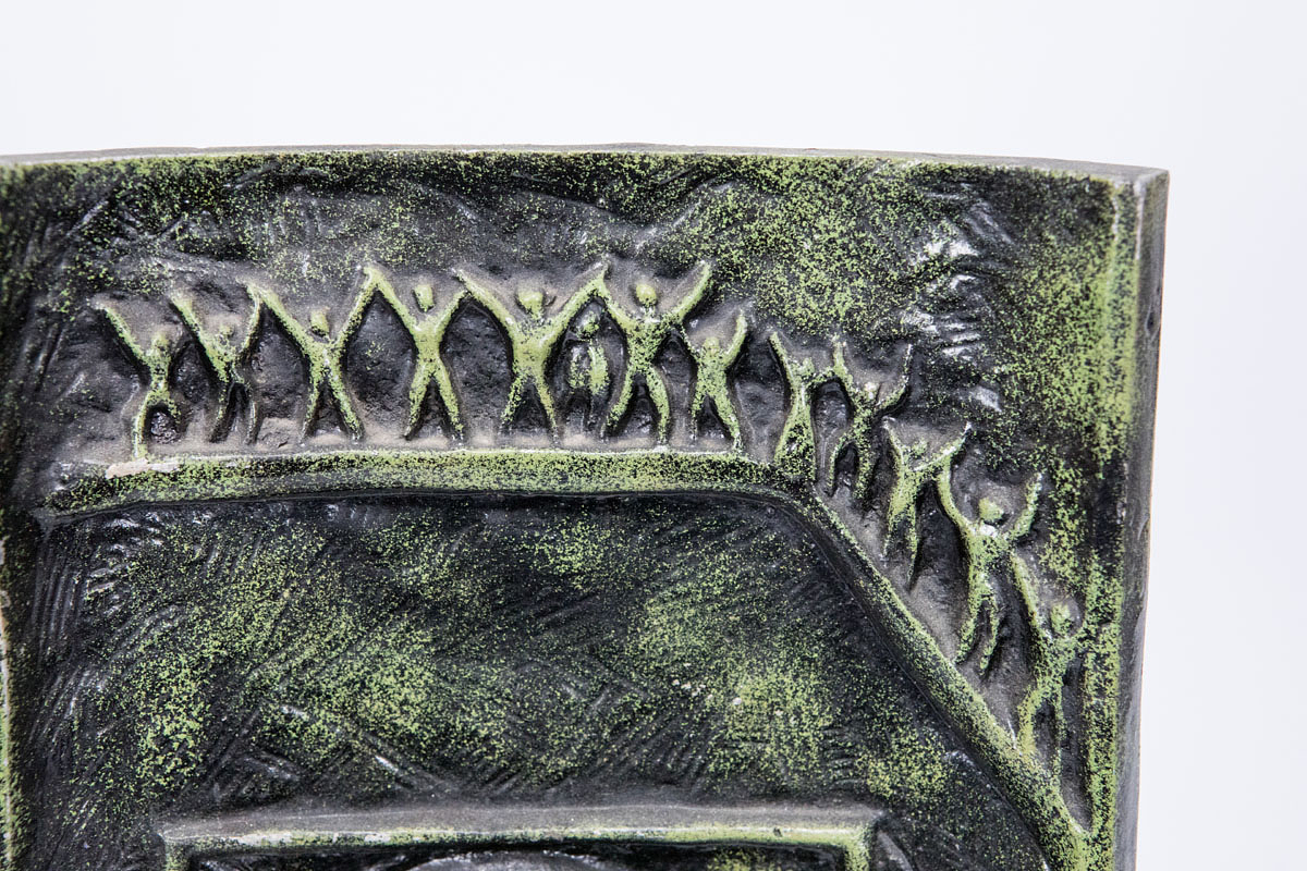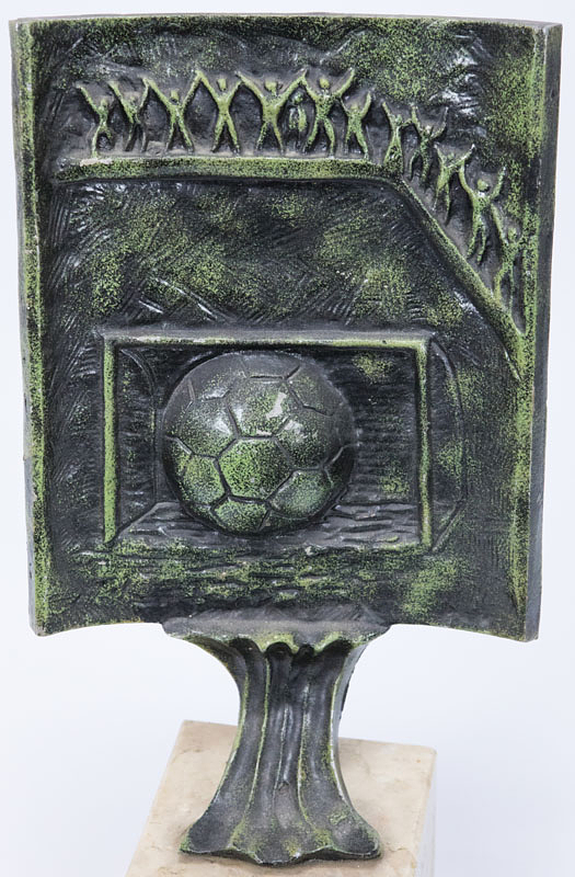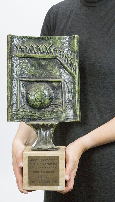 Ehrengeschenk der UEFA an den deutschen Bundestrainer Sepp Herberger mit aufmontierter, gravierter Plakette "Josef Herberger zum 60. Geburtstag in Anerkennung und Respekt UEFA Bern, 28. März 1957" (8x7,5 cm), die Plakette wurde auf einem Marmorsockel montiert. Der Marmorsockel ist mit einer modernen Bronzeskulptur mit Fußballmotiven versehen. Höhe: 41,5 cm. Unikat!.