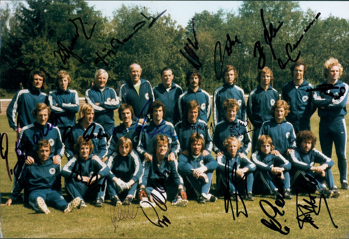 Farbfoto mit der deutschen Nationalmannschaft bei einem Vorbreitungslehrgang zur Fußball - Weltmeisterschaft 1974 mit 20 Originalsignaturen der deutschen DFB-Elf der Fußball-Weltmeisterschaft 1974. 30x20 cm.