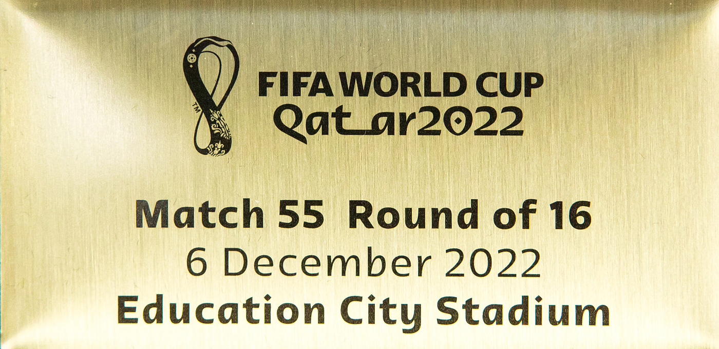 FIFA Weltpokal. Vergoldeter Tombakpokal auf schwarzem Sockel, dieser mit Metallschild mit WM 2022 Logo und Inschrift „FIFA World Cup Quatar 2022. Match 55 Round of 16 6 December 2022 Education City Stadium“ (Marokko v Spanien 0:0). Höhe 15 cm. In original Verpackung.