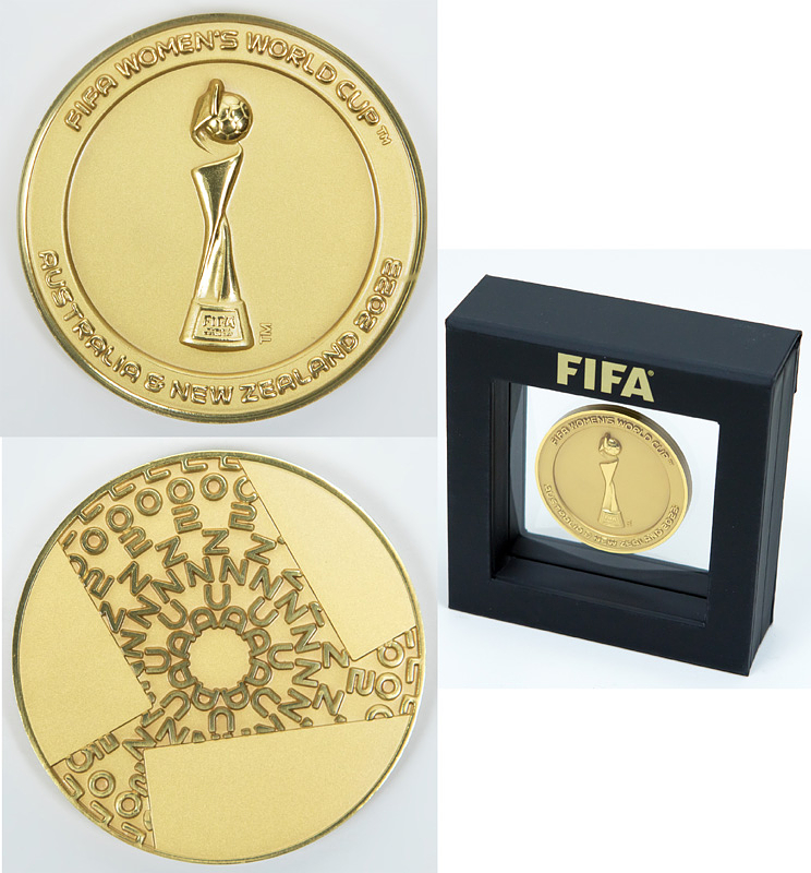 „FIFA Women´s World Cup 2023 Australia & New Zealand“. Offizielle Teilnehmermedaille für Betreuer, Funktionäre und Spielerinnen, die an der Frauen Fußball-Weltmeisterschaft 2023 teilnahmen. Bronze, vergoldet. 5,0cm. Im Originaletui.