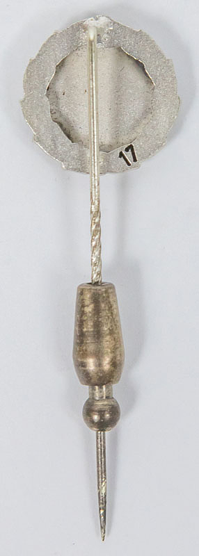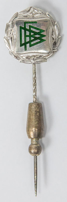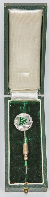 Goldene Ehrennadel des DFB mit Kranz für Ehrenmitglieder des DFB. Eine der höchsten Auszeichnung des Deutschen Fußballbundes. Weißgold, grün emailliert (gestempelt 525er, Gewicht: 3,56 Gramm ohne Verschlusskappe). Nummeriertes Exemplar Nr. 17. 1,7 cm. Unikat!. In original Box!.