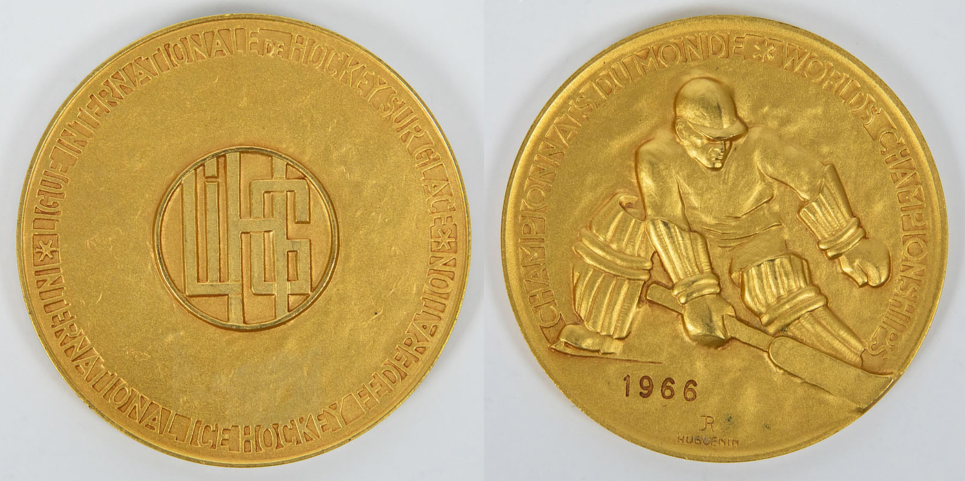 Goldmedaille der Eishockey - Weltmeisterschaften 1966 in Ljubljana mit der Inschrift „Championnat du Monde. World Championship" und der Gravur "1966“. Bekamen die Spieler der UdSSR für den Weltmeister Titel. Hersteller: "Hugenin". Bronze, vergoldet, 6 cm.