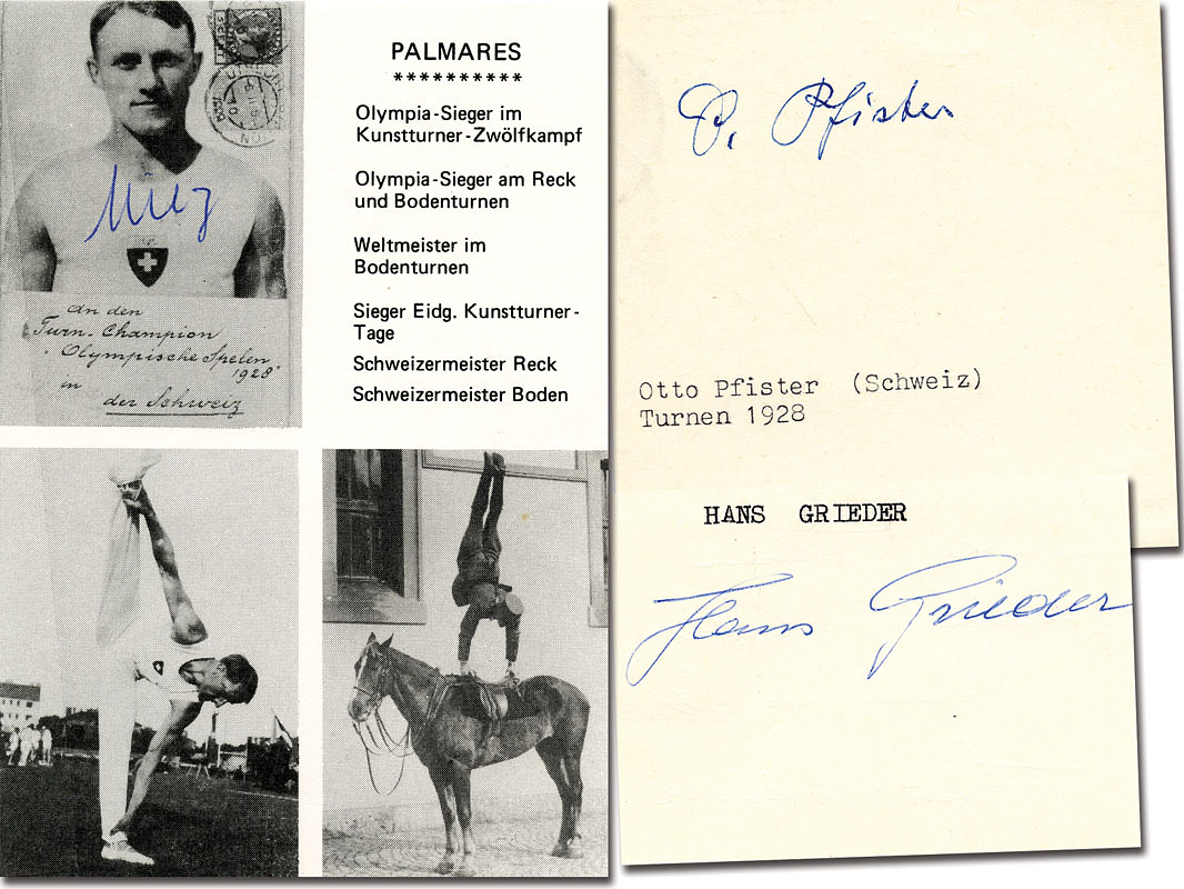 Goldmedaille im Turnen bei den Olympischen Spielen 1928 für die Schweiz im Mehrkampf - Mannschaft. Original Signaturen von Hans Grieder (1901-1995); Georges Miez (1904-1999; 4x Gold, 3x Silber , 1x Bronze 1924 - 1936) und Otto Pfister (1900 - verstorben). Alle drei Athleten gewannen im gleichen Wettbewerb 1924 Bronze. 14x10 bis 9x6 cm.