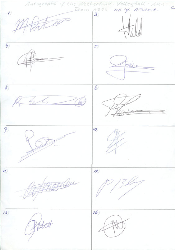 Goldmedaille im Volleyball Herren für die Niederlande bei den Olympischen Spielen 1996. Misha Latuhihin, Henk Jan Held, Brecht Rodenburg, Guido Görtzen, Richard Schuil, Ronald Zwerver, Bas van de Goor, Jan Posthuma, Olof van der Meulen, Peter Blangé, Rob Grabert, Mike van de Goor. Blancobeleg, 30x20 cm KOMPLETTES TEAM!.