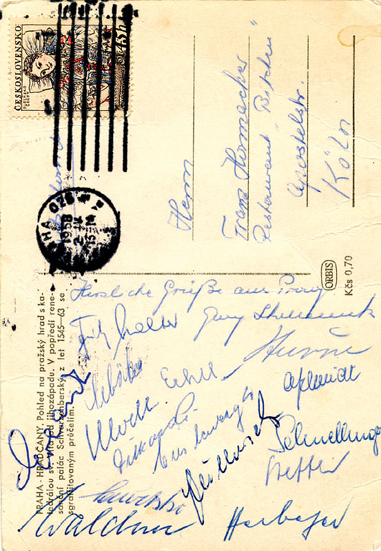 Grußpostkarte von Georg Stollenwerk vom Länderspiel gegen die CSSR am 2.4.1958 in Prag mit 16 Originalsignaturen der damaligen Trainer und Spieler. 15x10,5 cm.