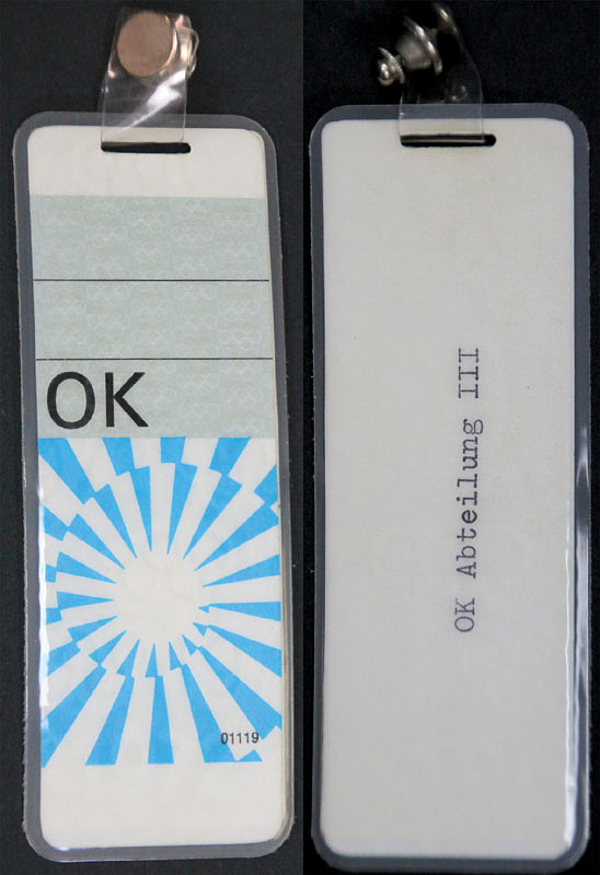 Offizielle Akkreditierungskarte von Walter Tröger (1929-2020; Bürgermeister des Olympischen Dorfes 1972 und 1989-2009 Mitglied des IOC) für die Olympischen Spiele München 1972. Kunststoff, 11x4 cm.