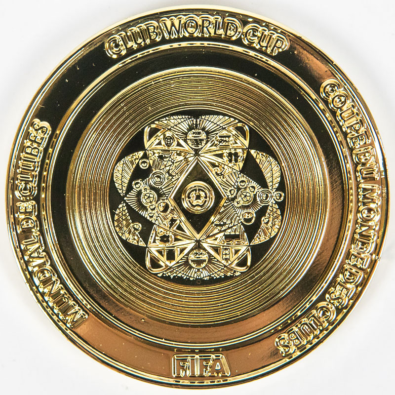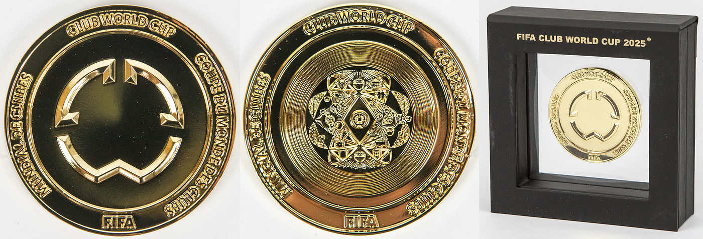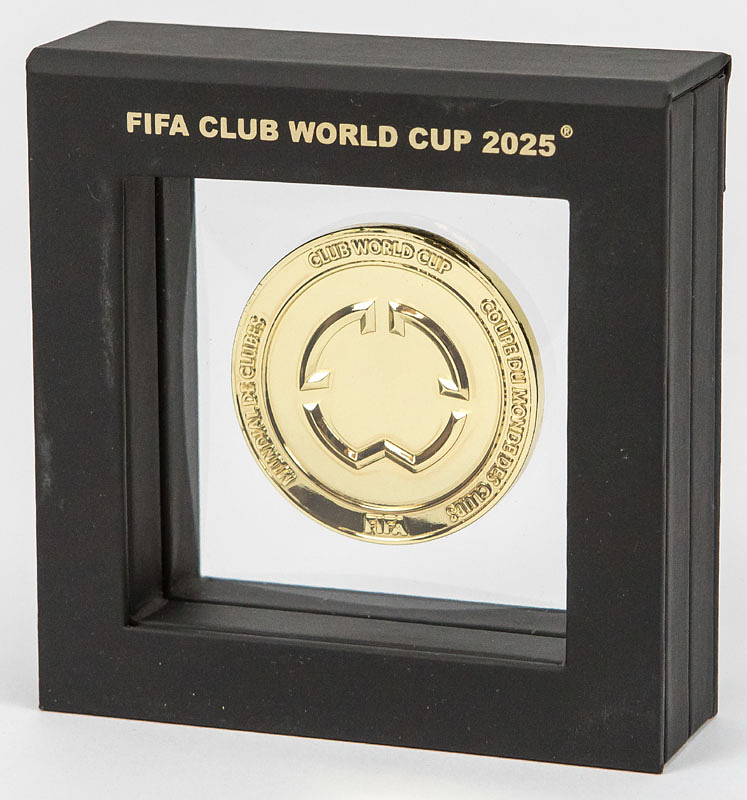 Offizielle Erinnerungsmedaille "FIFA Club World Cup 2025". Tombak, vergoldet, 5 cm. Im original FIFA-Rahmen (10x10x3 cm).