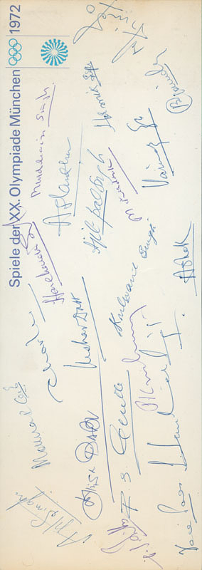 Offizielle Karte mit 22 original Signaturen der Hockey-Nationalmannschaft von Indien, Bronzemedailliengewinner der Olympischen Spiele 1972 von München, 28x9,5 cm.