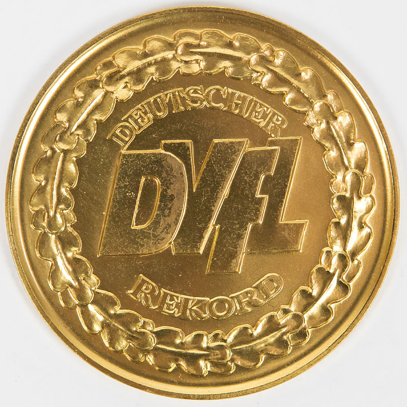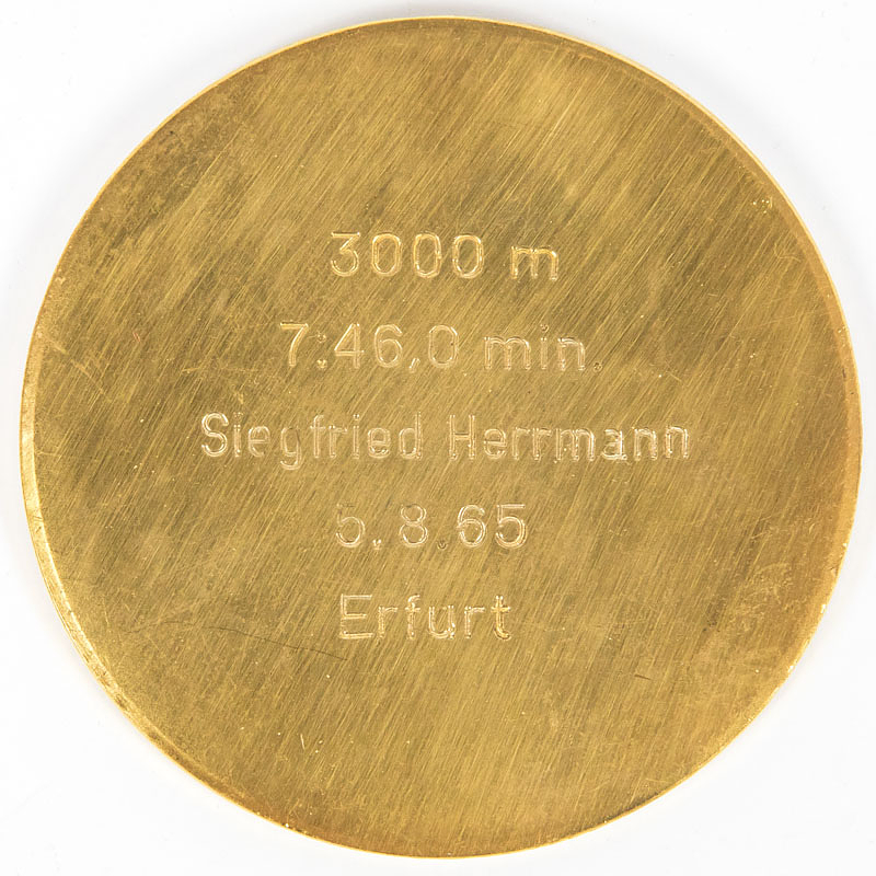 Offizielle Medaille des DVfL, Leichtathletikverband der DDR für einen "Deutscher Rekord". Mit rückseitiger Gravur "3000 m 7:46,0 min. Siegfried Herrmann 5.8.1965 Erfurt". Bronze, vergoldet. 8 cm. In original Box.