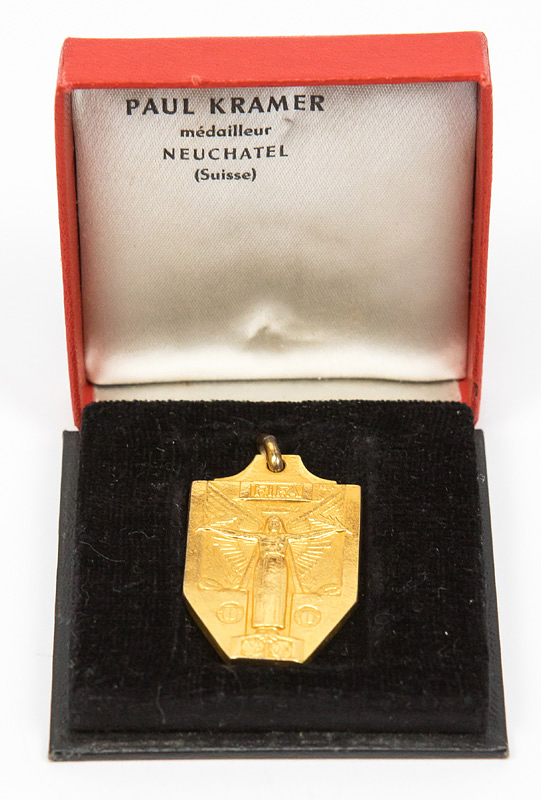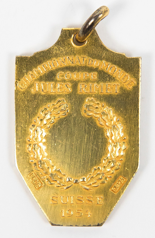 Offizielle Siegermedaille der FIFA für die ungarische Mannschaft für den 2.Platz bei der 5.Fußball-Weltmeisterschaft 1954 in der Schweiz. „Championat du Monde Coupe Jules Rimet Suisse 1954" Silber, vergoldet (gestempelt, 925er Silber. Hersteller: "PEKA"), 3,6x2,3 cm. Im original Pappetui mit goldgeprägtem Deckel und Pappscharnier (5,5x5,5x1,4 cm).