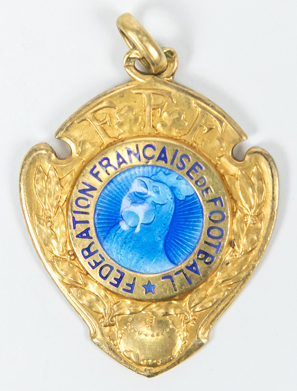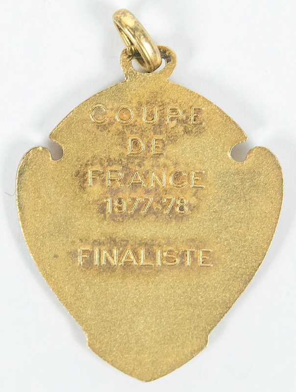 Offizielle Siegermedaille des französichen Fußballverbands FFF im Pokalendspiel 1979 AS Nancy – OGC Nizza 1:0 (0:0) für Spieler der unterlegenen Mannschaft von Nizza mit der Inschrift auf der Rückseite "Coupe des France 1977 - 1978 Finaliste". Silber, vergoldet mit aufgesetztem farbig emaillierten Logo des französischen Fußballverbandes, 3,6x3 cm.