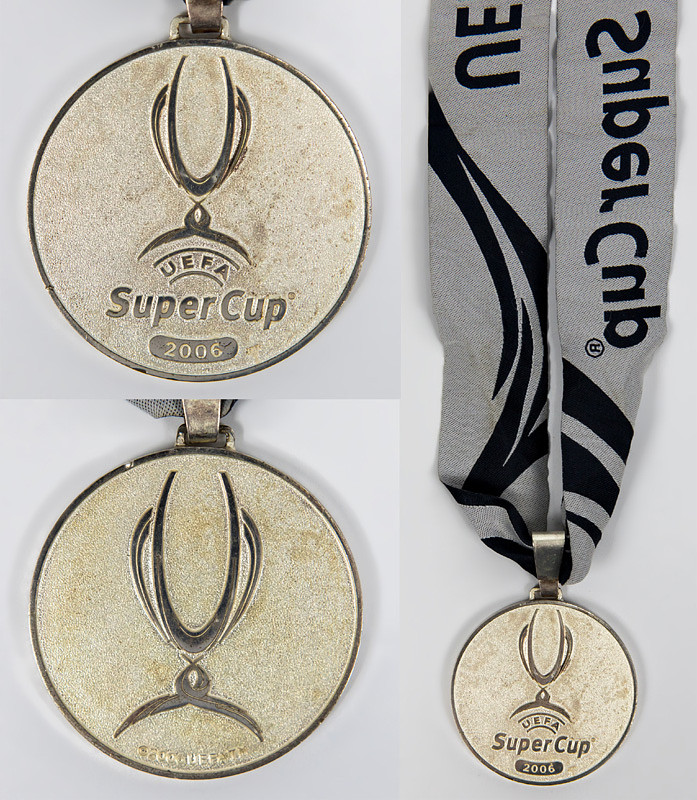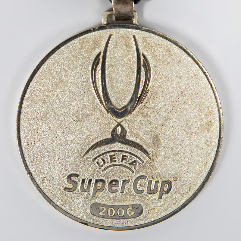 Offizielle Siegermedaille von Barcelona CF für das Endspiel um den Supercup am 25.8.2006 in Monaco: CF Barcelona v Sevilla FC (0:3) mit der Aufschrift "UEFA Super Cup 2006". Silber (gepunzt, 925er Silber, Gewicht: 66 Gramm), 5 cm mit original Seidenband.