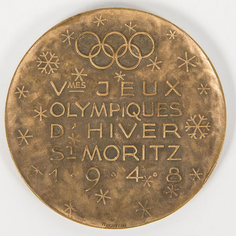 Offizielle Teilnehmermedaille für die 5.Olympischen Winterspiele 1948 in St.Moritz. "Vmes Jeux Olympiques d´Hiver St.Moritz 1948". Bronze, 4,3 cm.
