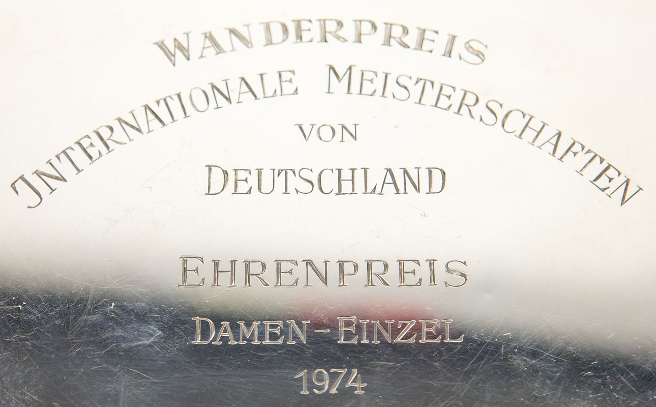 Offizieller "Wanderpreis Internationale Tennismeisterschaften von Deutschland. Ehrenpreis Damen - Einzel 1974" (Gravur auf der Vorderseite). Auf der Rückseite wurden die Siegerinnen von 1975 bis 1985 jährlich eingraviert. Silber (gepunzt 835er. Hersteller: "Wilkens". Gewicht: 172 Gramm), Durchmesser, 21 cm.