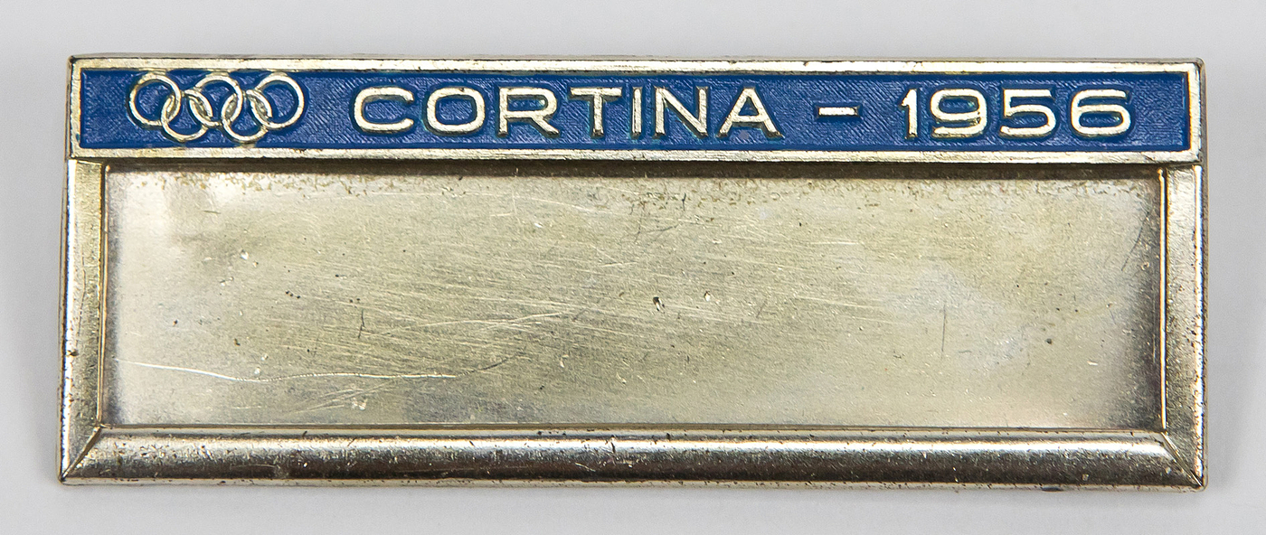 Offizielles Abzeichen für die Olympischen Winterspiele in Cortina d´Ampezzo für Namen- oder Länderschildchen. Blau emalliert mit der Aufschrift "Cortina - 1956" und den Olympischen Ringen. Messing verchromt, 6x2,3 cm. Dabei original Papierverpackung.