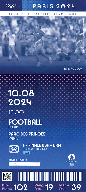 Offizielles Druckticket der Olympischen Spiele Paris 2024. 10.8. Finale Frauen - Fußball USA v Barsilien. 20,5x9 cm.