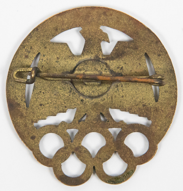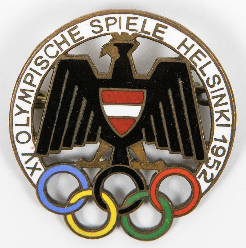 Offizielles Mannschaftsabzeichen von Österreich für die Olympischen Spiele 1952 mit der Aufschrift "XV. Olympische Spiele Helsinki 1952". Bronze, vergoldet, farbig emailliert, 3,5 cm.