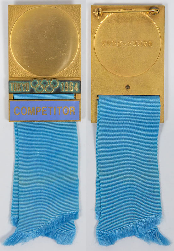 Offizielles Teilnehmerabzeichen Tokyo 1964 „Competitor“ (Athlet) für Schwimmen. Bronze, vergoldet. Schriftleiste hellblau emailliert. Seidenband hellblau. 12x3,8cm.