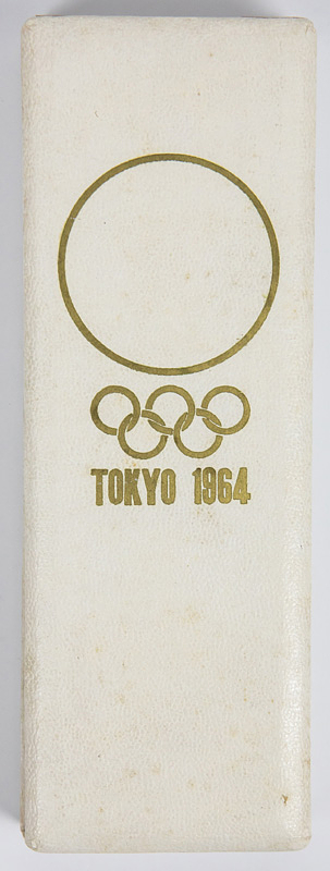 Offizielles Teilnehmerabzeichen Tokyo 1964 „O.O.C. Official“. (Olympic Organisation Comittee). Bronze, vergoldet. Schriftleiste blau emailliert. Seidenband in weiß-gelb. 14x3,8cm. In Originaletui.