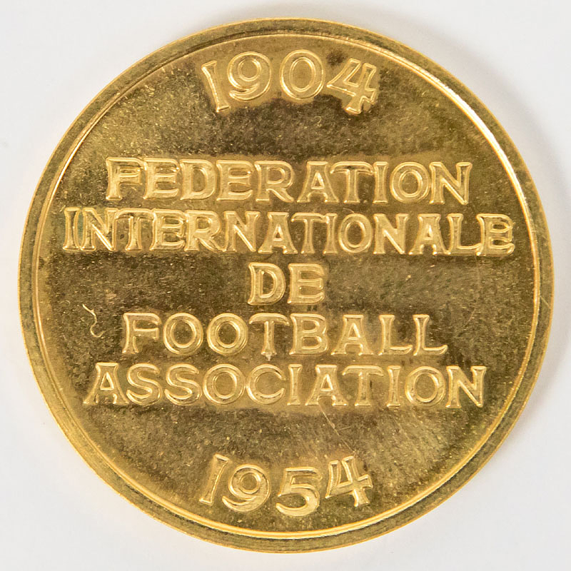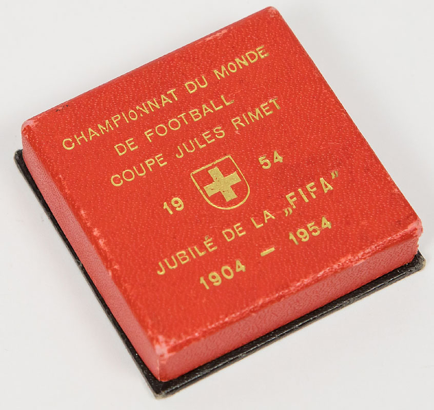 ORIGINAL Gold Gedenkmünze. „Championat du Monde“ Fußball Weltmeisterschaft 1954. Gold (900er Gold, 27 Gramm; Goldwert am 19.10.2025: 2.794 €), 3,3 cm in original Box mit der Aufschrit "Championat du Monde Couoe de Football Jules Rimet 1954. Jubile de la FIFA 1904 - 1954 (5,5x5,5x1,5 cm).