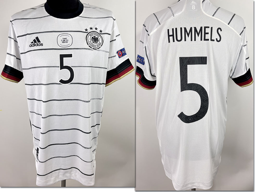 Original match worn DFB Spielertrikot mit der Nummer 5. Getragen von Mats Hummels im Europameisterschaftsspiel Spiel gegen Frankreich am 15.06.2021 in München.Trikot stammt aus der Sammlung eines ehemaligen DFB-Mitarbeiters. Status: AAB.